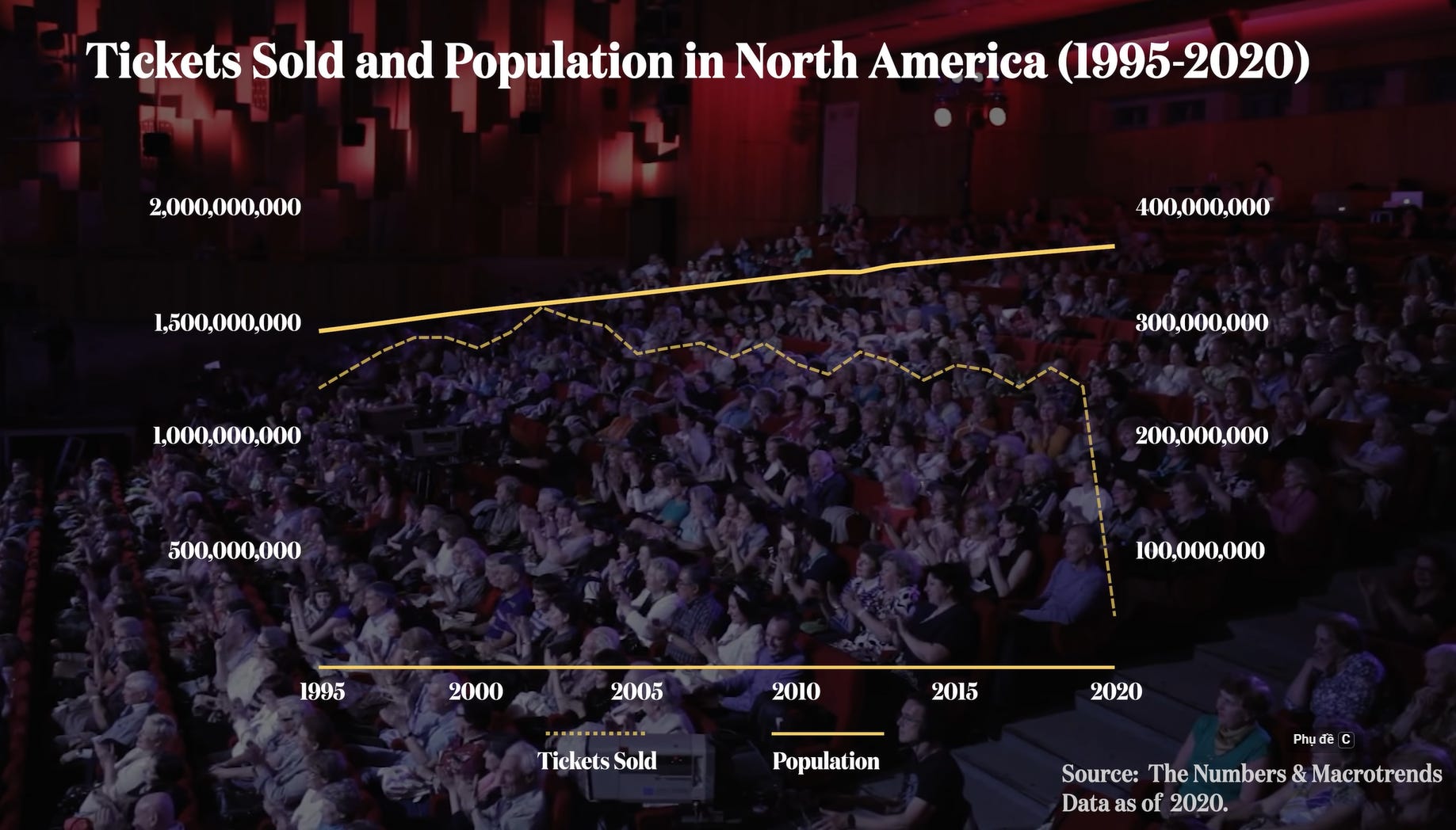Số vé bán ra ở Mỹ giảm liên tục suốt hai thập kỷ, dù dân số và giá vé đều tăng.