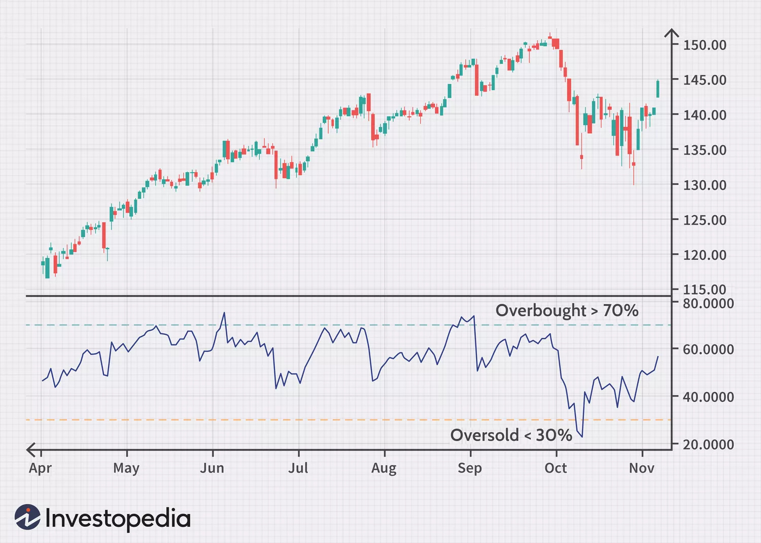 Cổ phiếu được coi là quá mua khi chỉ số RSI trên 70 và quá bán khi nó dưới 30.