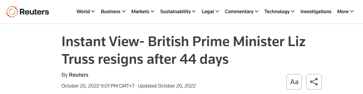 Truss từ chức sau 44 ngày - ngắn nhất trong lịch sử nước Anh. Gói chính sách bị rút lại hoàn toàn. Thị trường ổn định trở lại.