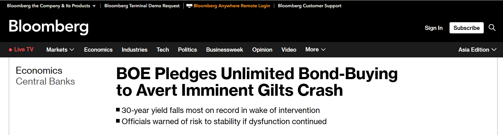 BoE buộc phải can thiệp khẩn cấp - mua vào trái phiếu dài hạn để ngăn thị trường vỡ trận, đúng vào lúc đáng lẽ phải thắt chặt tiền tệ để chống lạm phát.