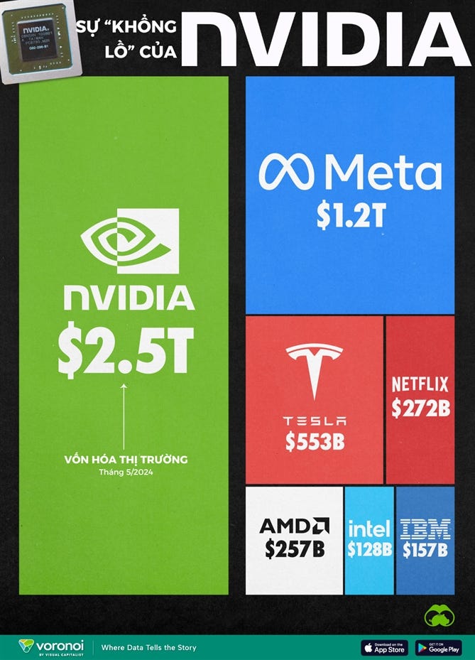 Dù vậy, ít ai nghĩ Nvidia có thể duy trì đà phát triển này lâu dài. Kết quả, sau 25 năm lên sàn, tăng 5910 lần (591,078% - bao gồm cả tái đầu tư cổ tức), trở thành top 5 doanh nghiệp có vốn hóa lớn nhất thế giới, cao hơn vốn hóa của Meta, Tesla, Netflix và Intel cộng lại.