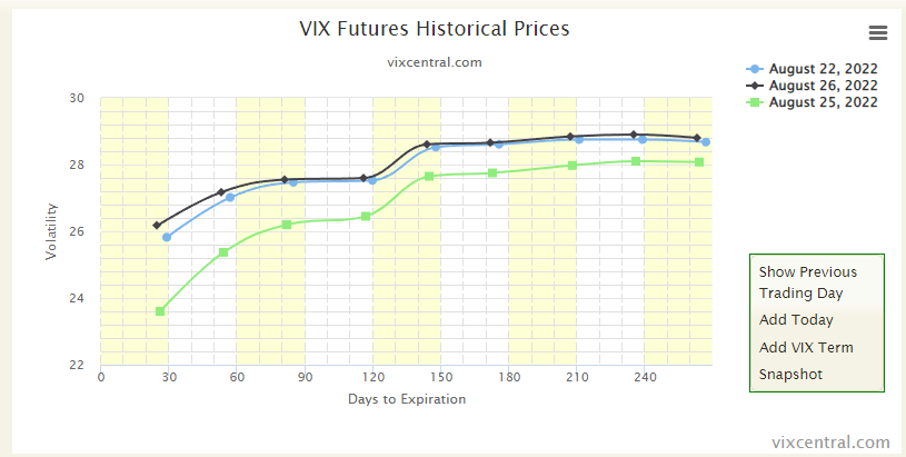 Sau bài phát biểu của Powell, VIX future tăng mạnh trong ngày thứ 6, tuy nhiên, chỉ trở về level ngày thứ 2 trước đó, mặc dù thị trường nhìn chung rớt khá sâu so với đầu tuần. Điều này cho thấy VIX có thể tiếp tục đi lên khá cao nếu như tâm lí lo sợ tiếp tục ở lại thị trường, đặc biệt từ các bài phát biểu liên tục của thành viên FOMC trong tuần tới.