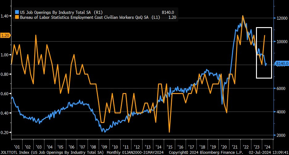 Thông thường: Số lượng đăng tuyển lao động của doanh nghiệp (job openings) giảm dần thường đi kèm với Chi phí lao động cũng sẽ giảm theo.