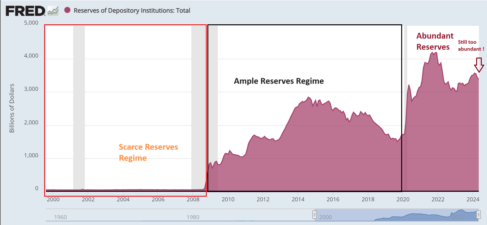Dự trữ tiền mặt của các ngân hàng tại Fed: dù đã giảm đáng kể từ khi Fed thực hiện QT, nhưng vẫn cao hơn nhiều so với thời kỳ trước Covid.