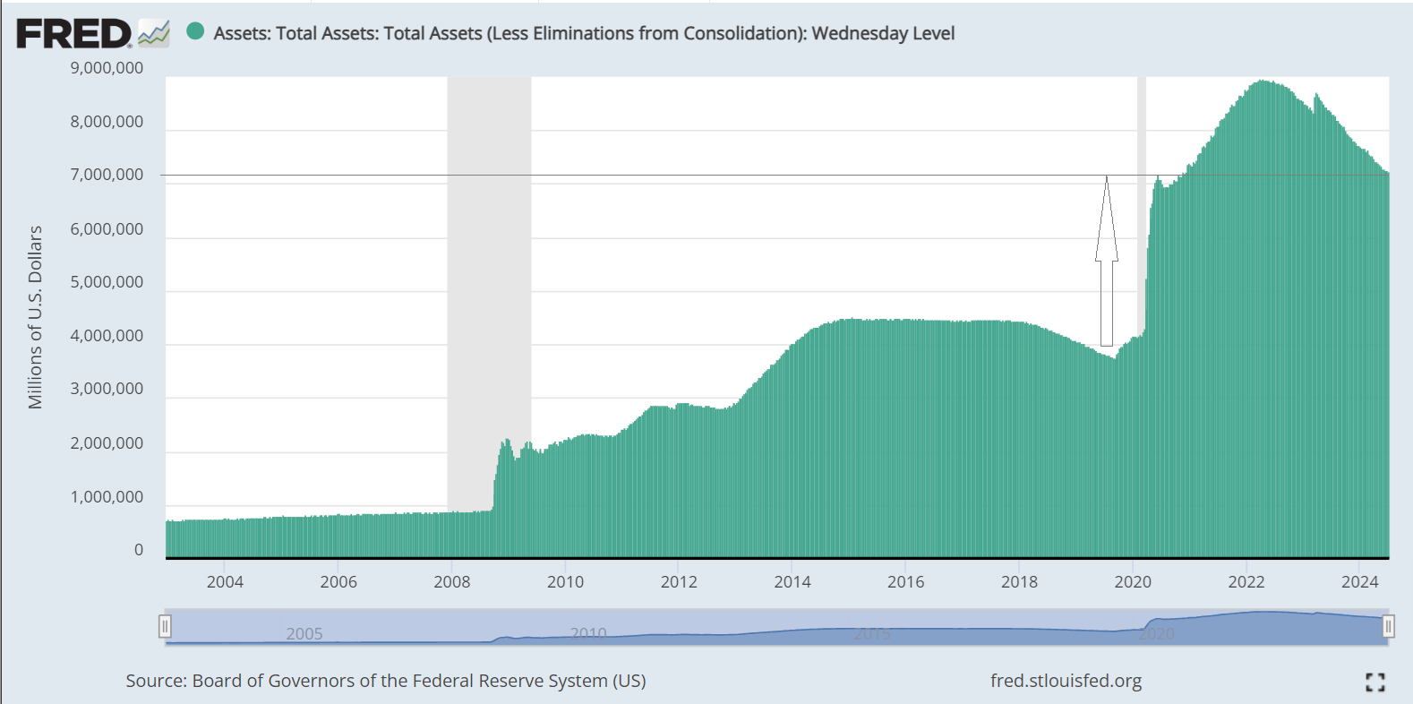 Chính sách QT vẫn khá “hời hợt” khi bảng cân đối kế toán của Fed dù đã giảm nhưng vẫn không về lại mức trước Covid.