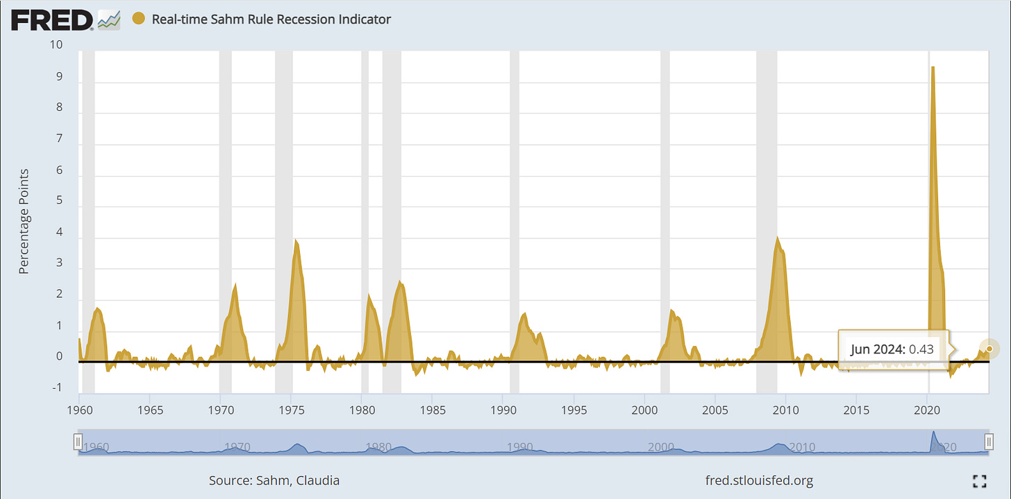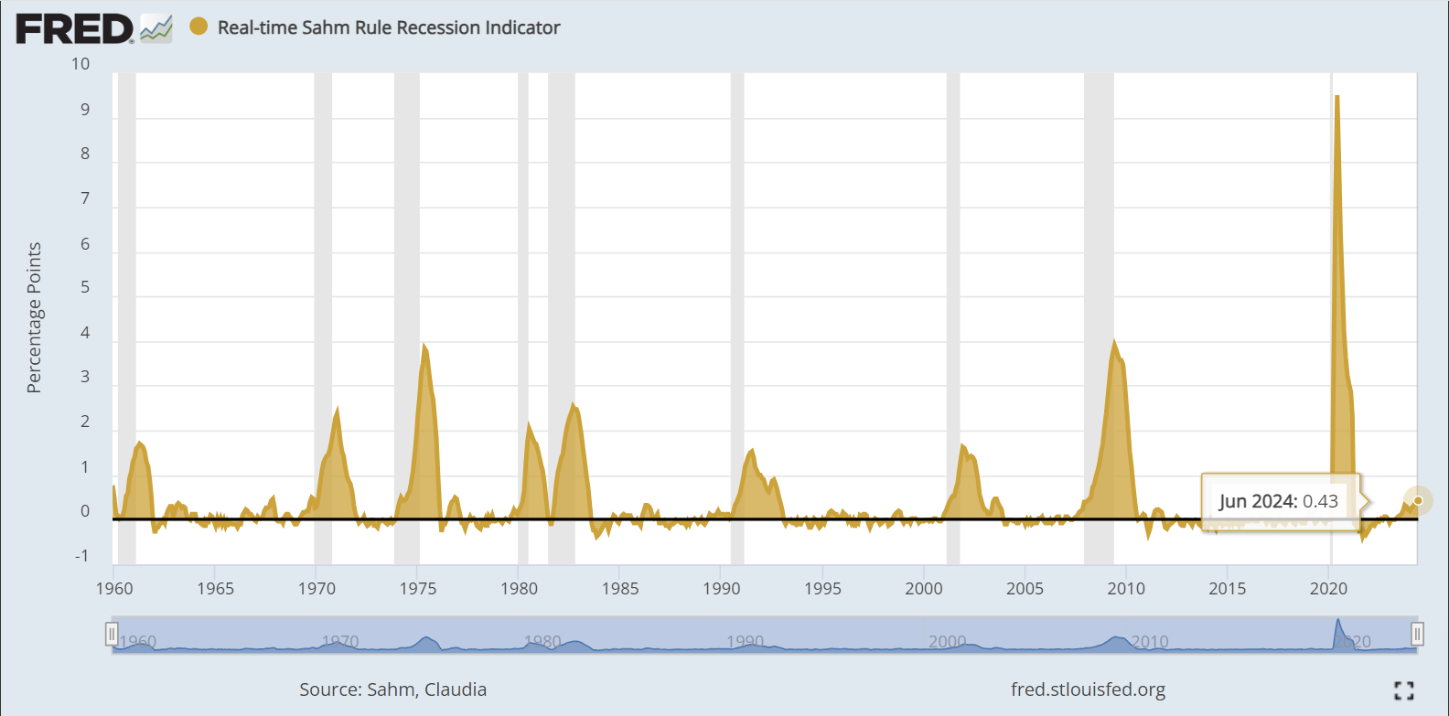 Với tỷ lệ thất nghiệp 4.1% trong tháng 6, chỉ báo suy thoái lao động Sahm Rules đã tăng lên ngưỡng 0.43% — rất gần với mức báo động suy thoái (0.5%)