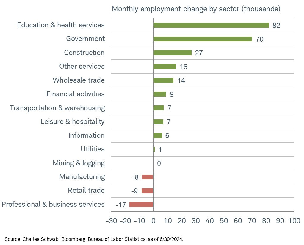Hơn ⅔ việc làm mới được tạo ra trong tháng 6 đến từ khối công (government) và dịch vụ an sinh xã hội được trợ cấp bởi chính phủ (y tế và giáo dục):