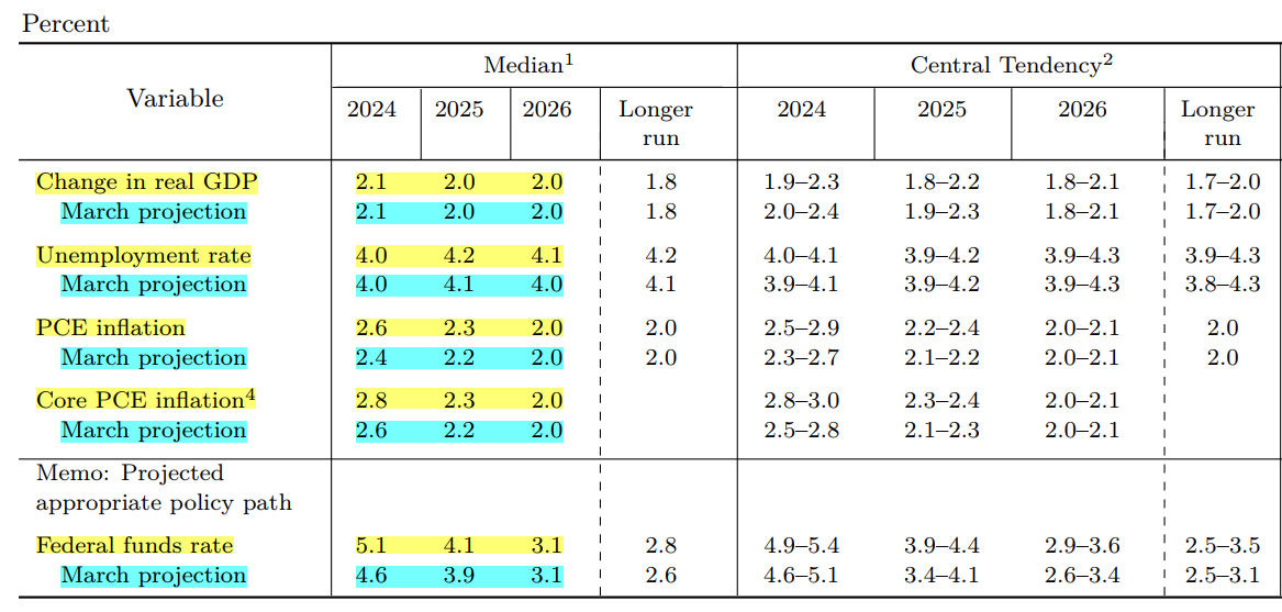 Với bộ ba: lạm phát PCE (+2.6% y/y) + tăng trưởng GDP (+1.4% quý I/2024) + tỷ lệ thất nghiệp (4.1%) diễn biến ngoài dự trù của Fed trong FOMC tháng 6; rất có khả năng: