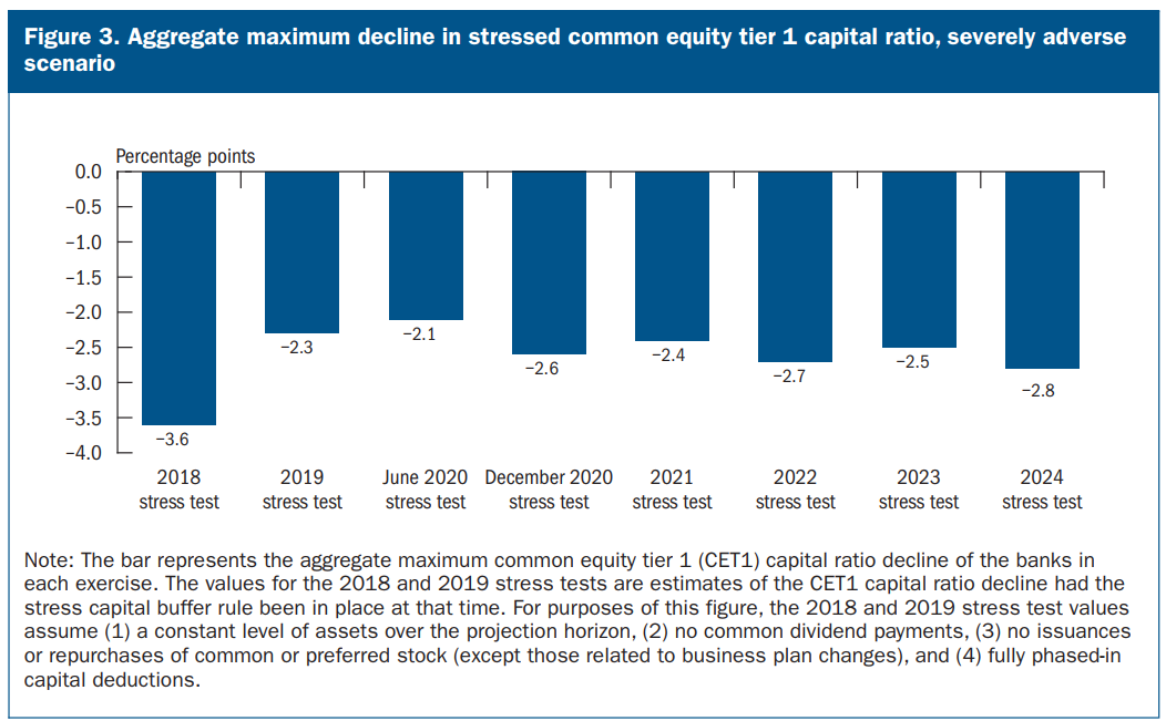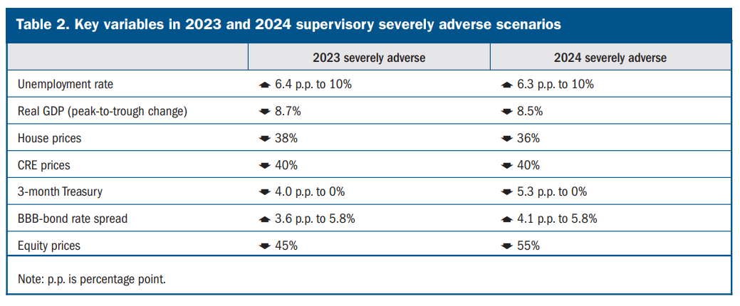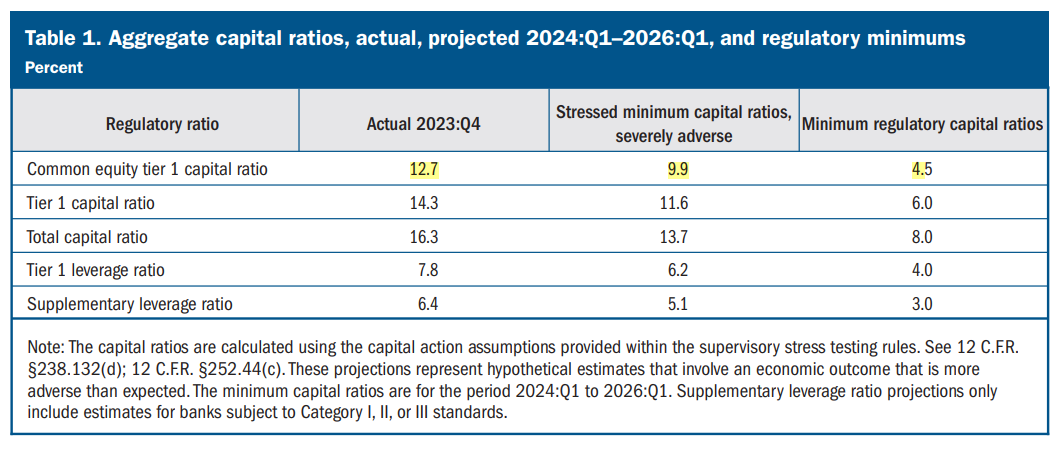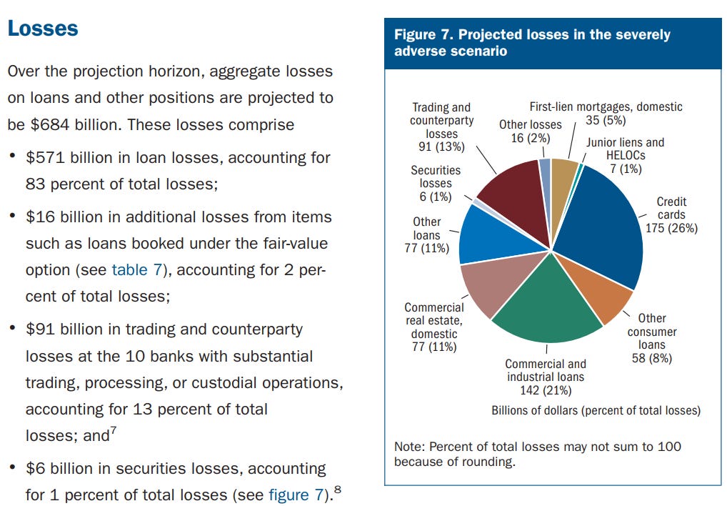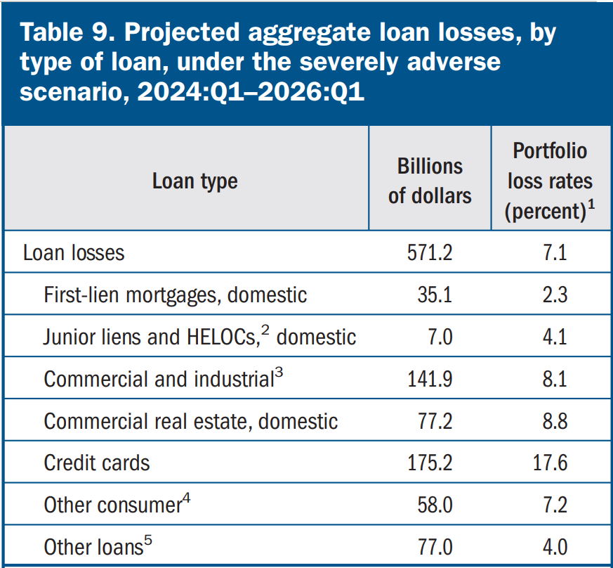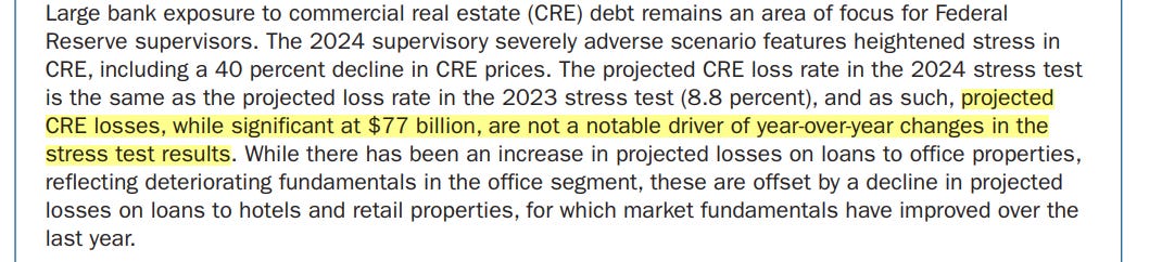 Báo cáo stress-test năm nay có đề cập đến khoản lỗ CRE (dự đoán: - USD 77 tỷ trong điều kiện kinh tế xấu nhất đối với 31 ngân hàng lớn) không phải là vấn đề đáng lo ngại.