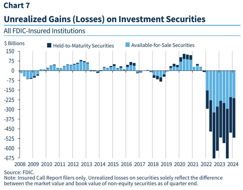 Các khoản lỗ chưa thực hiện (unrealized loss) của hệ thống ngân hàng vẫn ở mức cao — do yếu tố vĩ mô khi môi trường lãi suất ở mức cao!
