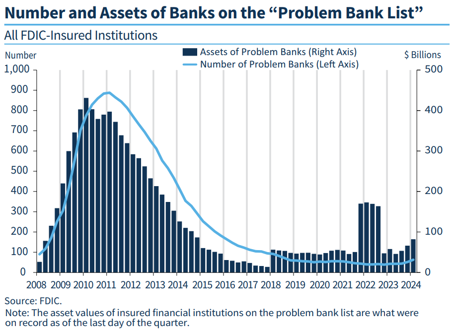 Số lượng các ngân hàng đang gặp rắc rối (“problem bank list”) đã tăng lên 63 trong quý I/2024 (con số này chỉ là 52 vào quý IV/2023).