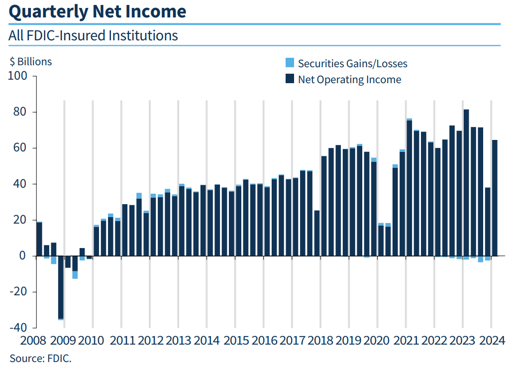 Trong quý I/2024, thu nhập ròng (net income) của các ngân hàng tăng thêm: + USD 28.4 tỷ (đạt 64.2 tỷ USD quý I/2024).
