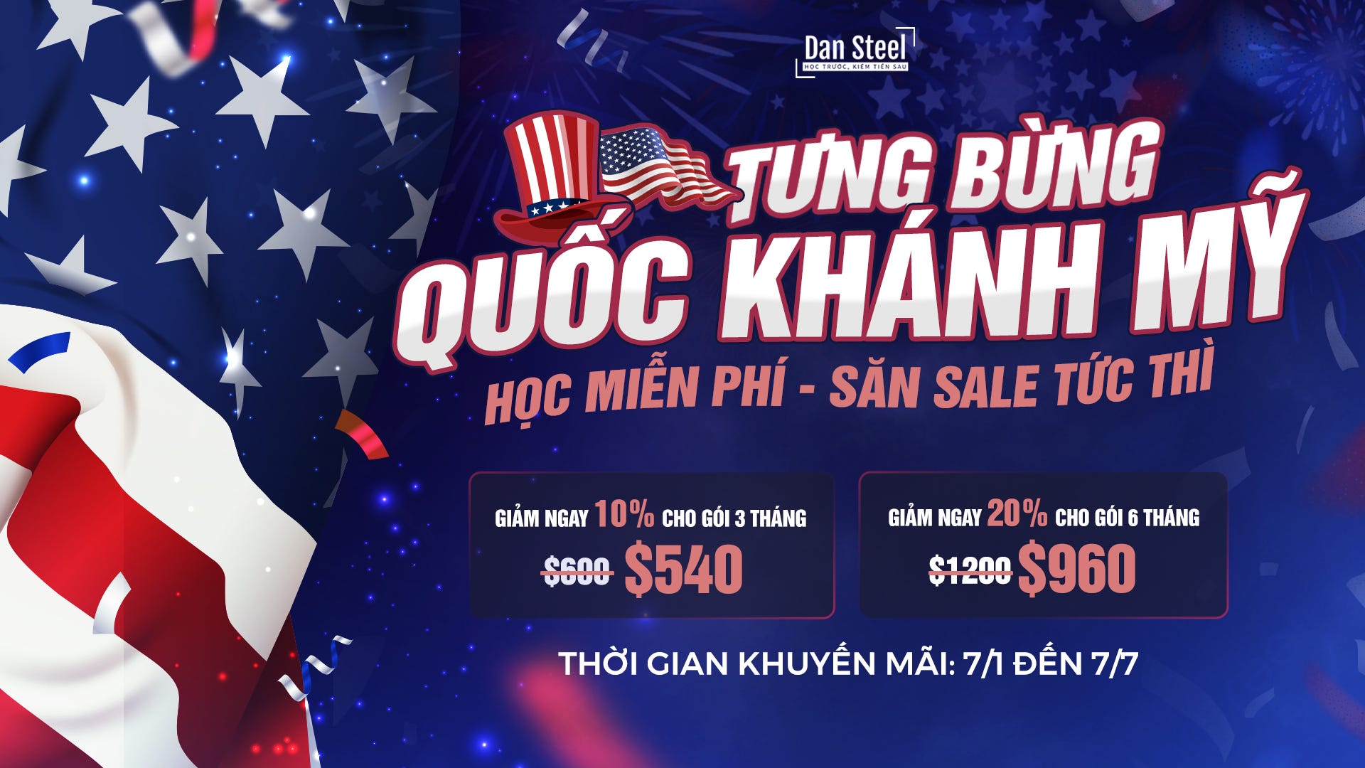 Trong dịp Quốc khánh Mỹ này, Viet Hustler mang đến cho bạn cơ hội săn khuyến mãi hấp dẫn khi đăng ký trở thành thành viên vàng của Dan Steel Trading Club: