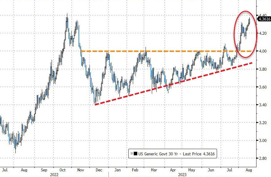 Lợi suất trái phiếu 30 năm tăng 7 điểm cơ bản lên 4.42%, mức cao nhất kể từ tháng 10 năm ngoái.