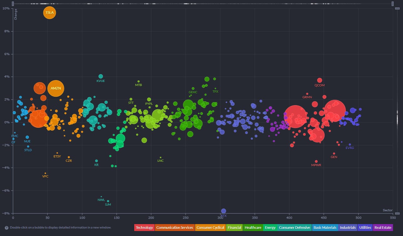 Thị trường mở cửa phiên giao dịch đầu tuần mới trong tâm lí khá ổn định sau 2 ngày rally cuối tuần qua. Các cổ phiếu công nghệ và đặc biệt là khối mega cap tiếp tục là nơi thu hút phần lớn dòng tiền trong môi trường thanh khoản giảm đáng kể trong buổi sáng. Tesla, Amazon và Meta là 3 cổ phiếu gồng gánh SPX về gần tới 4500 sau 3 đợt pull-back đầu giờ với Tesla đẩy +9.5% chỉ trong buổi sáng sau khi công bố đã tăng gấp đôi thị phần tại Trung Quốc, giúp Morgan Stanley nâng price target từ $250 lên $400.