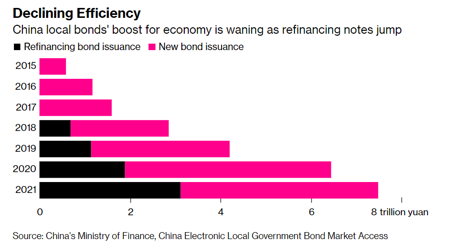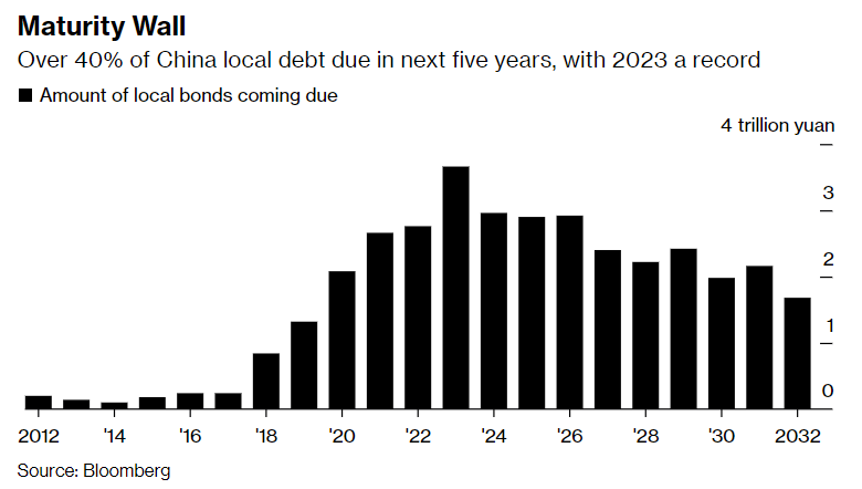 Chính quyền địa phương của 31 tỉnh tại Trung Quốc đang đối mặt với áp lực nợ giá trị trái phiếu gần CNY 15 nghìn tỷ (~USD 2.1 nghìn tỷ), sẽ đáo hạn trong vòng 5 năm tới.