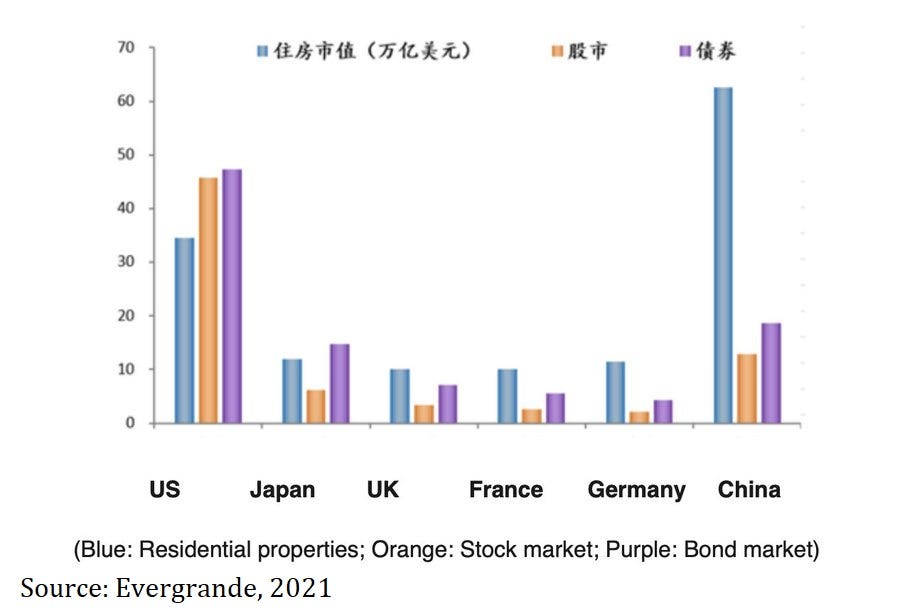 Giữa năm 2021: Ước tính giá trị BDS nhà ở tại Trung Quốc là USD 62.6 nghìn tỷ (cột màu xanh dương). Tại thời điểm đó, giá trị BDS Trung Quốc: