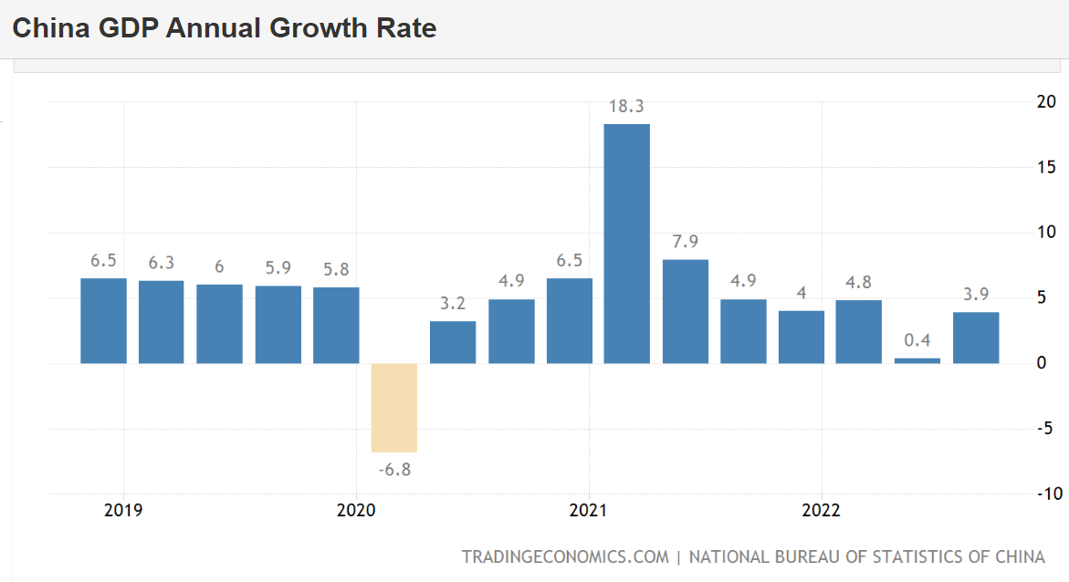 Vào tháng 10/2022, tình hình tăng trưởng kinh tế Trung Quốc đã khả quan hơn dù vẫn ở mức thấp: tăng trưởng GDP quý 3 (Y/Y) ở mức +3.9% cao hơn so với dự đoán (+3.3%) và quý 2 (+0.4%)