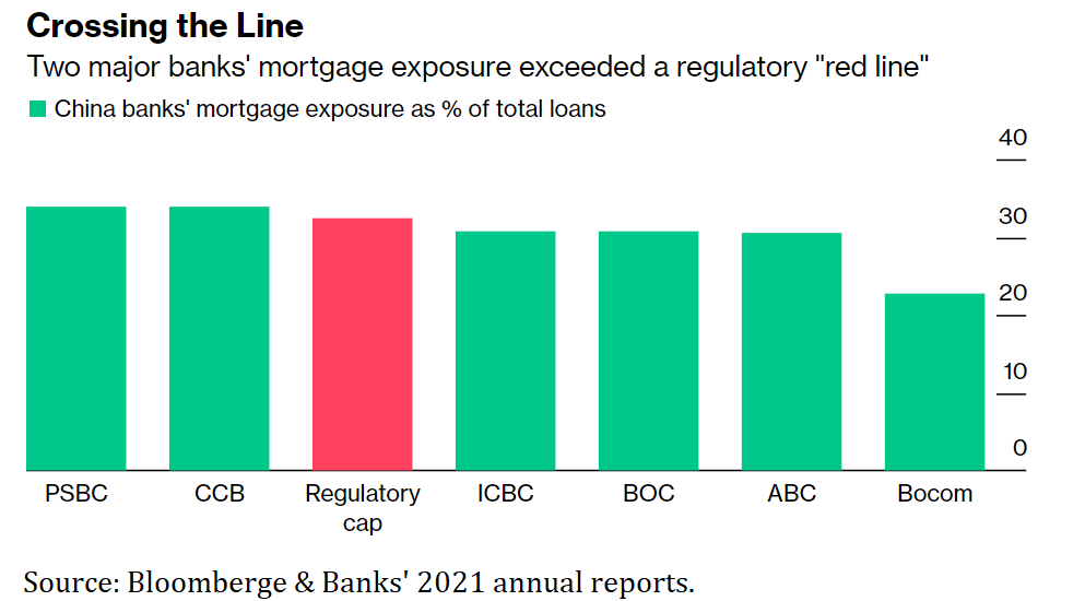Các khoản nợ thế chấp mua nhà chiếm khoảng 34% tổng số khoản vay tại Postal Savings Bank of China và China Construction Bank vào cuối năm 2021, cao hơn mức trần quy định là 32.5% (cột màu đỏ) đối với các ngân hàng lớn.