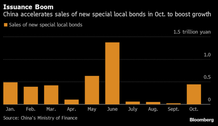 Các tỉnh của Trung Quốc vào tháng 10 đã phát hành số lượng trái phiếu đặc biệt mới cao nhất kể từ tháng 6, để đáp ứng thời hạn của Bắc Kinh sử dụng hết CNY 500 tỷ (70 tỷ USD) trong hạn mức nợ bổ sung, nhằm thúc đẩy tăng trưởng kinh tế.