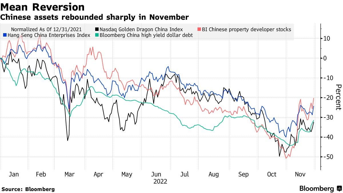 Các nhà đầu tư đã lấy lại được niềm tin vào việc đầu tư tại Trung Quốc sau sự thay đổi về chính sách của chính phủ về 2 vấn đề: nới lỏng quy định về nguồn vốn cho các nhà phát triển bất động sản và nới lỏng chính sách Zero Covid.