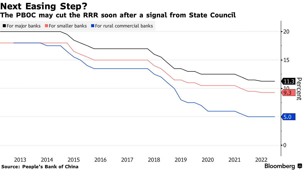 Trước tình hình nguội lạnh của nền kinh tế, ngân hàng Trung Ương Trung Quốc (PBOC) sẽ sớm bơm thanh khoản vào nền kinh tế thông qua cắt giảm RRR - lượng tiền mặt dự trữ của các ngân hàng thương mại - sau tín hiệu từ Hội đồng PBOC tuần trước.