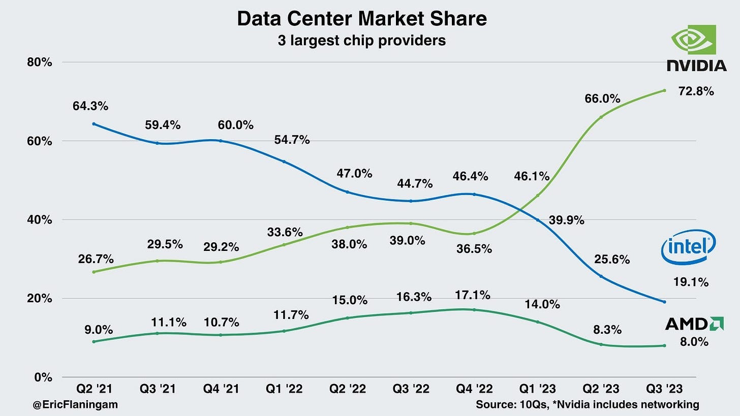 Tháng 7/2021, Intel chiếm 64% thị phần chip trung tâm dữ liệu, Nvidia 26%, AMD 8%.